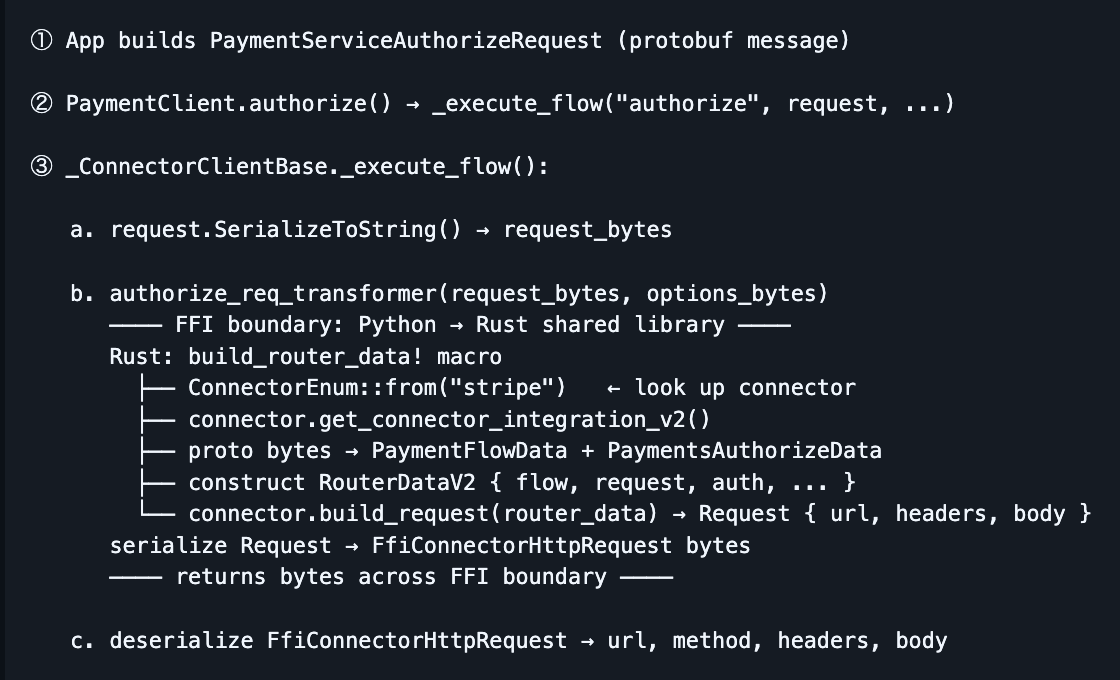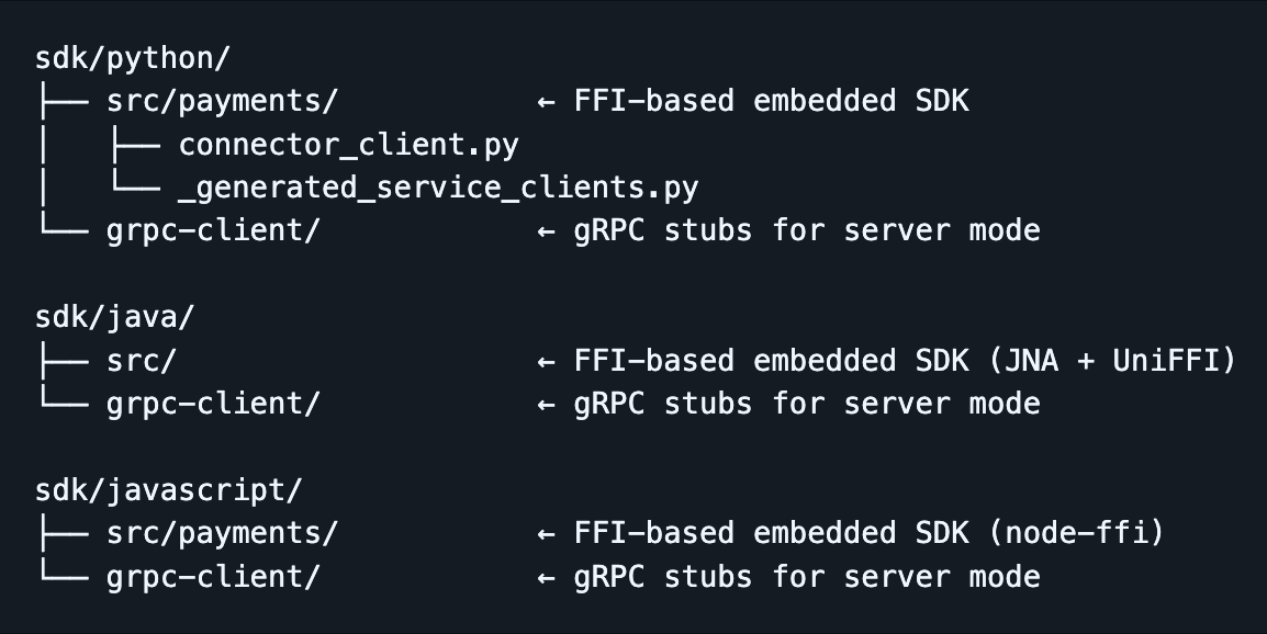 A few reasons. First, we already had 100+ connector implementations in Rust from Hyperswitch, so starting there was practical. But more importantly: the library needs to be embeddable in Python, JavaScript, and Java applications without a separate process or a runtime dependency like the JVM or a Python interpreter. The only realistic way to distribute a native library that loads cleanly into all of those runtimes is as a compiled shared library — .so on Linux, .dylib on macOS. Rust produces exactly that, with no garbage collector pauses, no runtime to ship, and memory safety that does not require a GC.