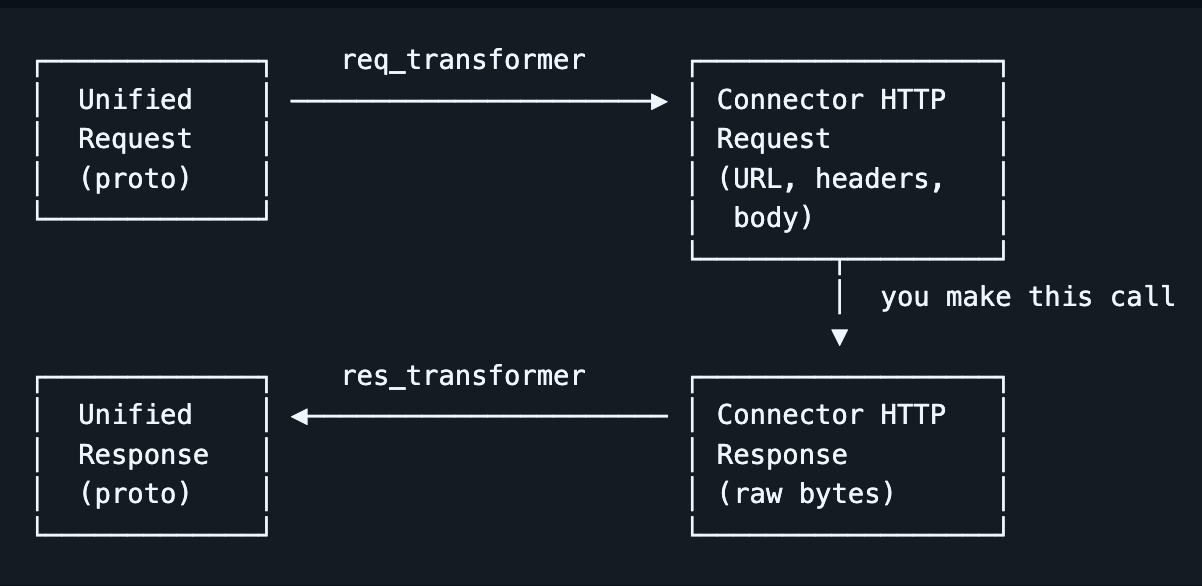 req_transformer takes your unified protobuf request and returns the connector-specific HTTP request - the URL, the headers, the serialized body. You make the HTTP call however you like. res_transformer takes the raw response bytes plus the original request and returns a unified protobuf response.