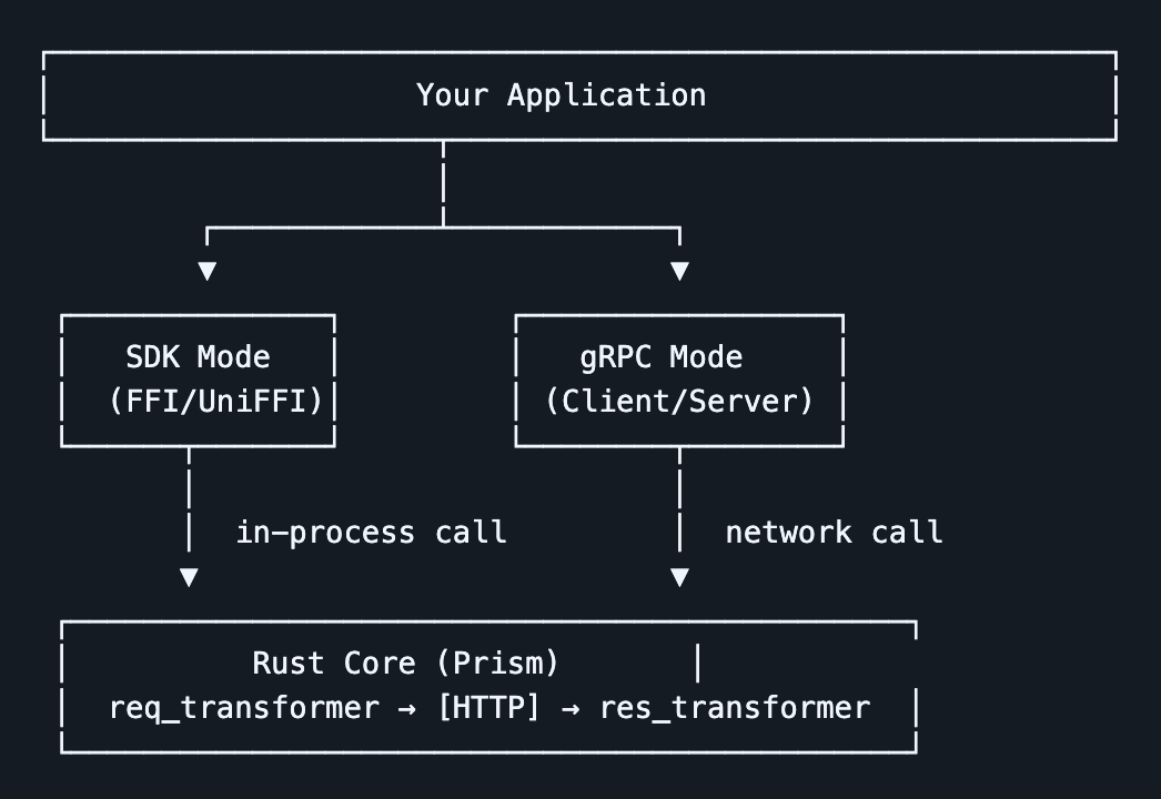 The gRPC server calls the same Rust core transformers as the FFI layer — just from a different entry point. The transformation logic is literally the same code path. The difference is that the HTTP client lives inside the server process, not in the caller's.