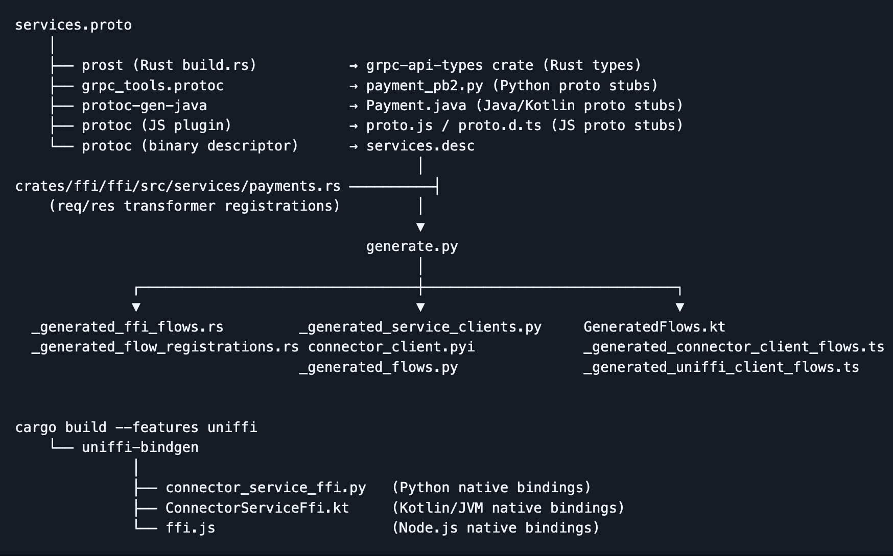 The practical result: add a new flow to services.proto, implement the transformer pair in Rust, run make generate — and every language SDK gets a typed, documented method for that flow. No one writes boilerplate by hand.