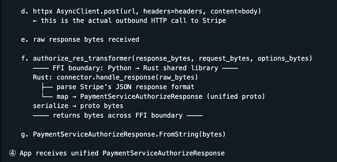 Everything is strongly typed. PaymentService.Authorize takes a PaymentServiceAuthorizeRequest - amount, currency, payment method details, customer, metadata, capture method and returns a PaymentServiceAuthorizeResponse with a unified status enum, connector reference IDs, and structured error details. No freeform JSON blobs. No stringly-typed status fields. The spec is the contract.